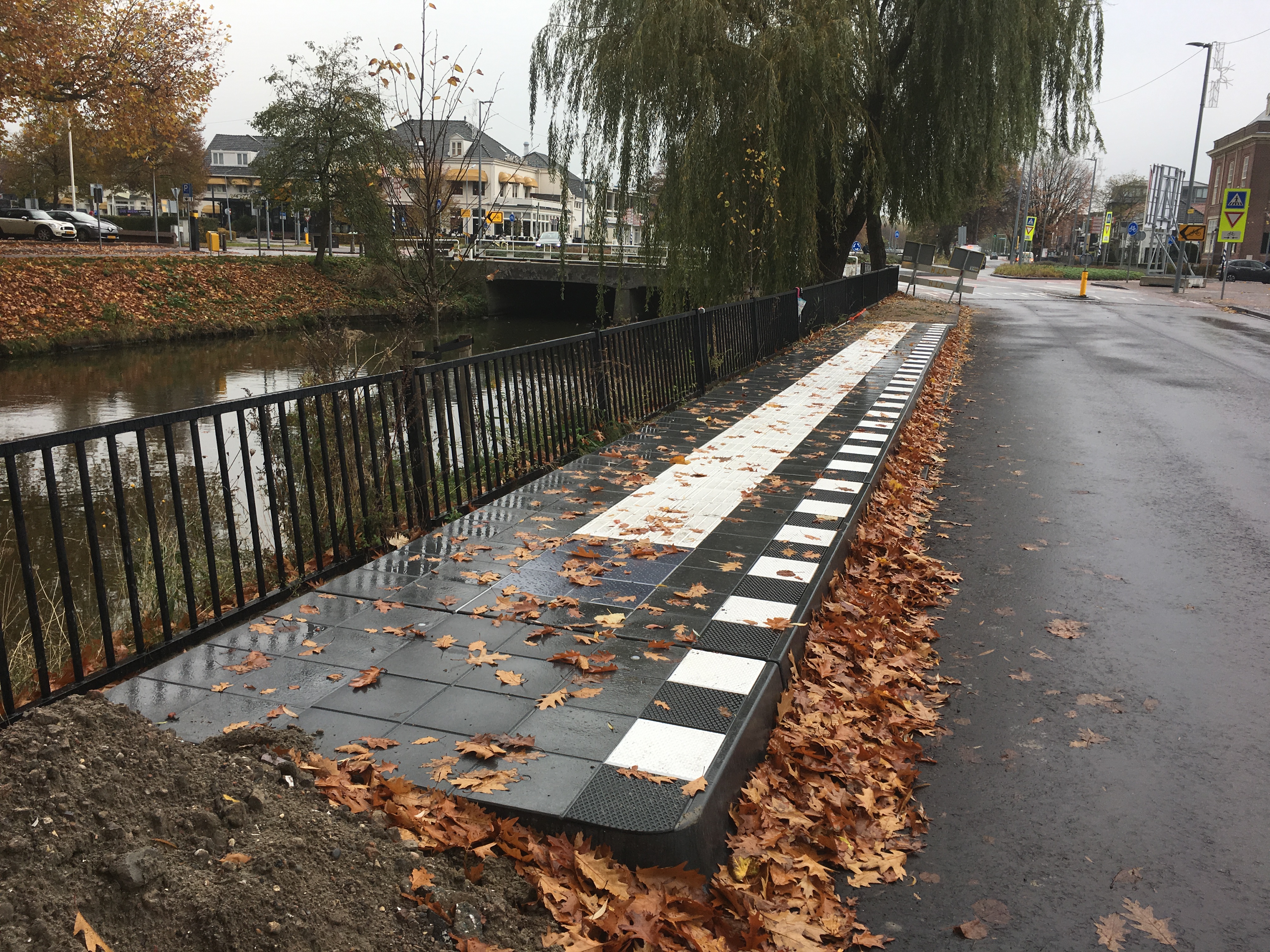 • geleidevoorzieningen als geleidelijnen, instapmarkering en waarschuwingsmarkering reeds prefab aangebracht;