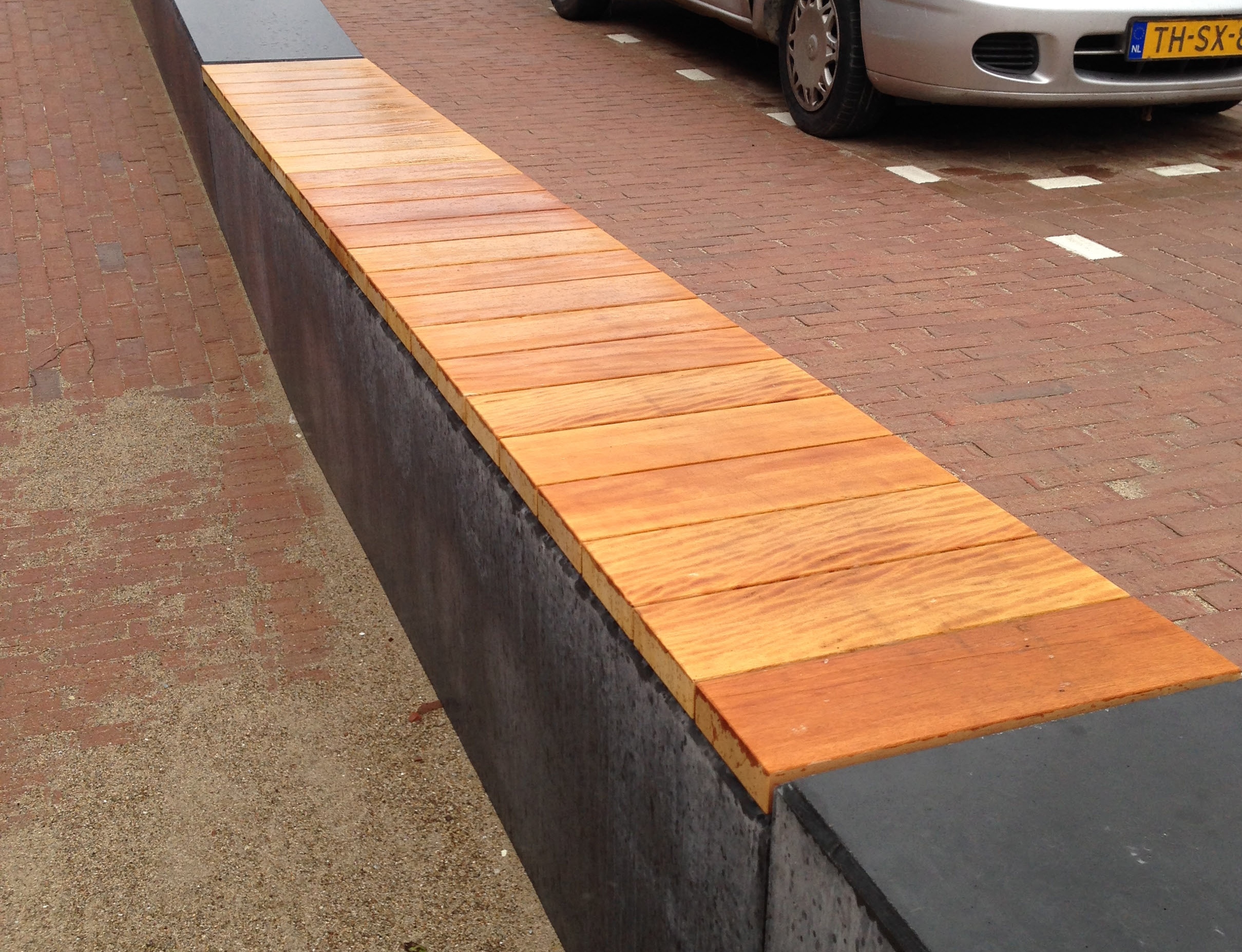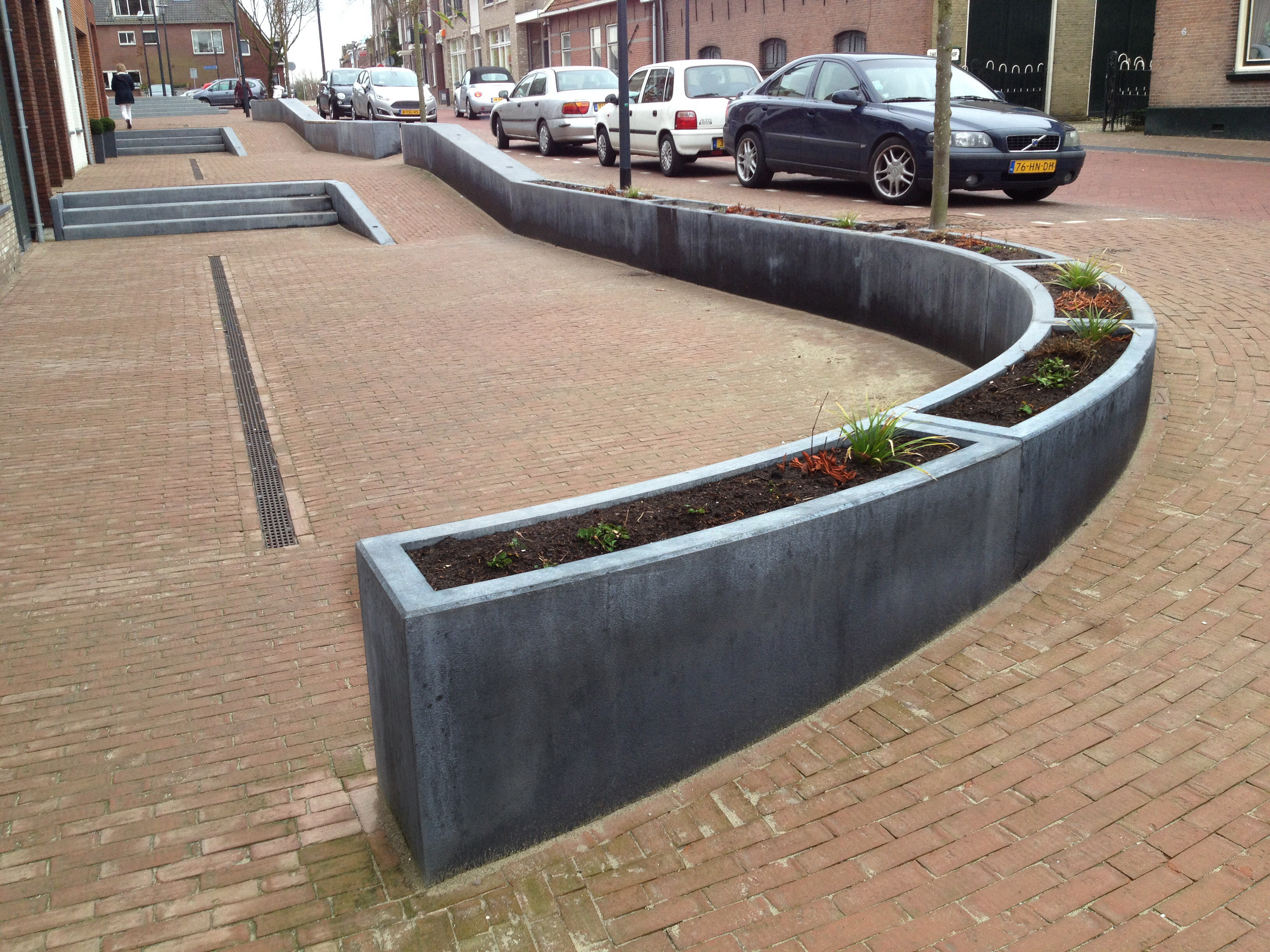 Hierdoor moest er een oplossing worden gevonden voor de hoogteverschillen ter plaatse van de nieuwbouw. Naar een ontwerp van Buro Imoss werd het geheel tot uitvoering gebracht. De antracietkleurige betonnen Giro Parkbanden 50x100 cm (bxh) en traptreden