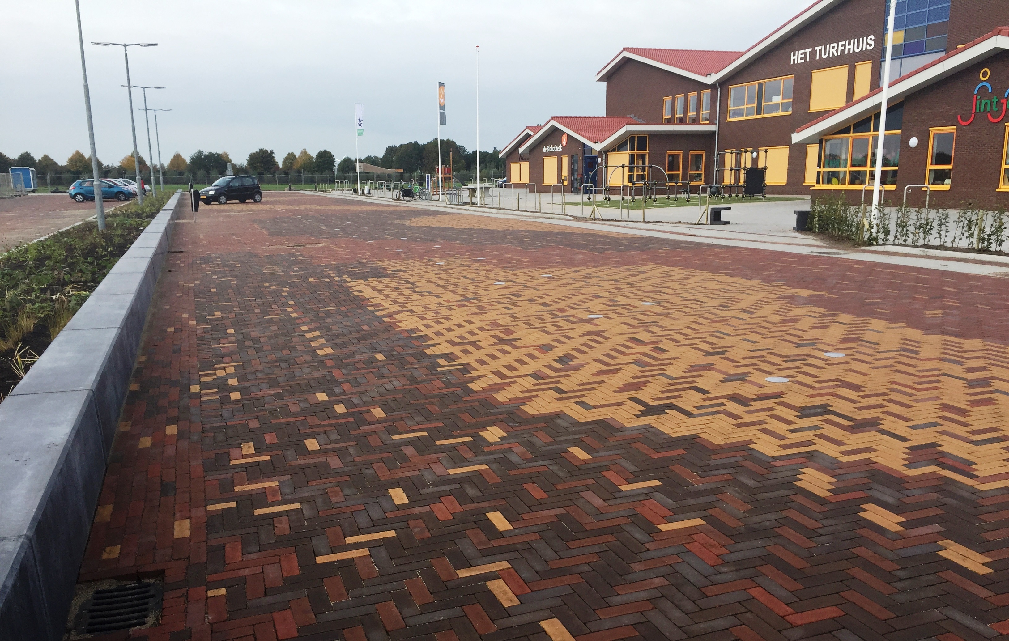 De Kiss & Ride strook is uitgevoerd met gebakken dikformaten geleverd in een speciale mix met de kleuren rood, bruin en geel.