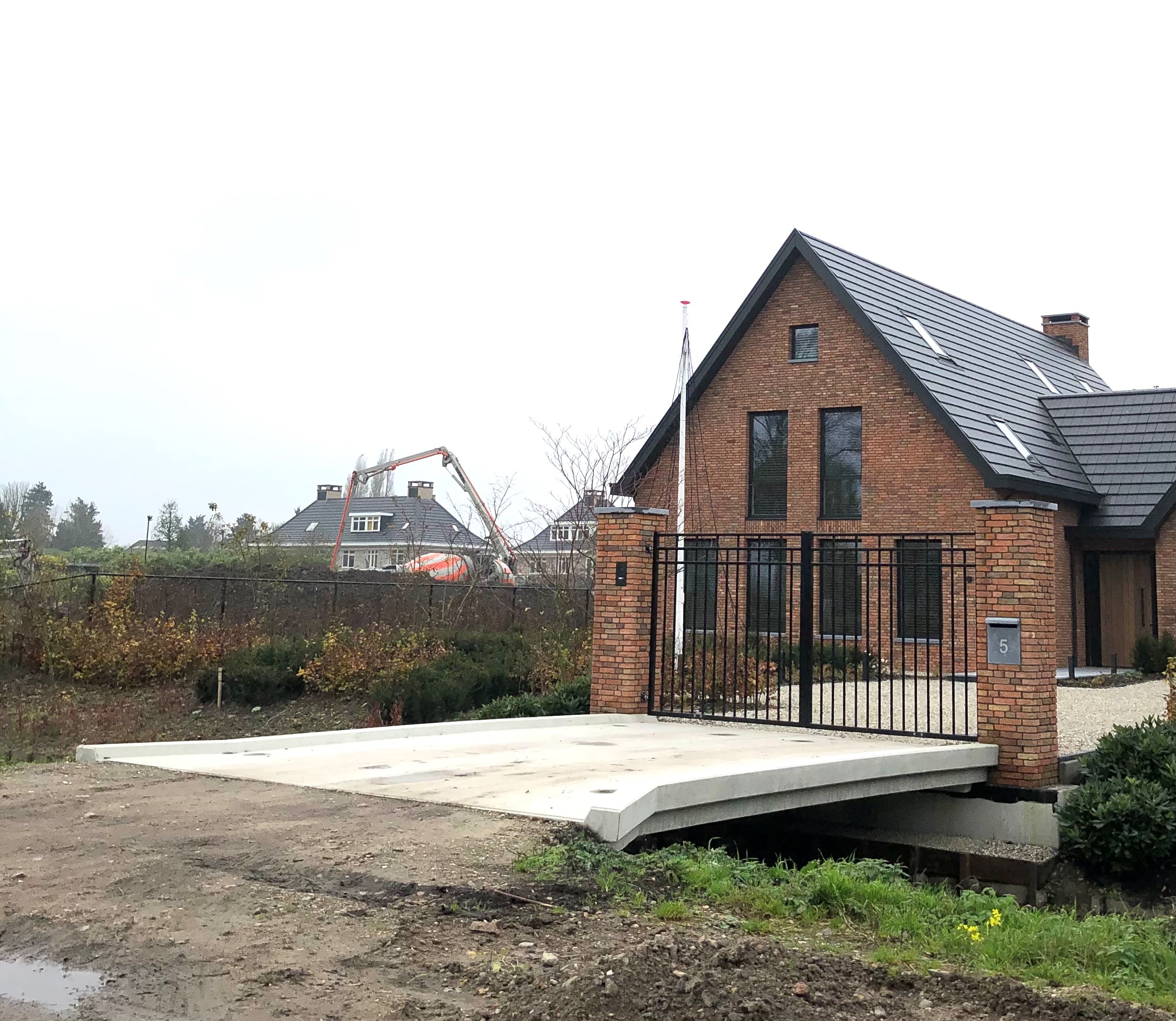 De bewoners van deze fraaie woning in Rhoon zijn blij met de realisatie van de prefab betonnen Omega-brug en daarmee de goede bereikbaarheid van hun woning.