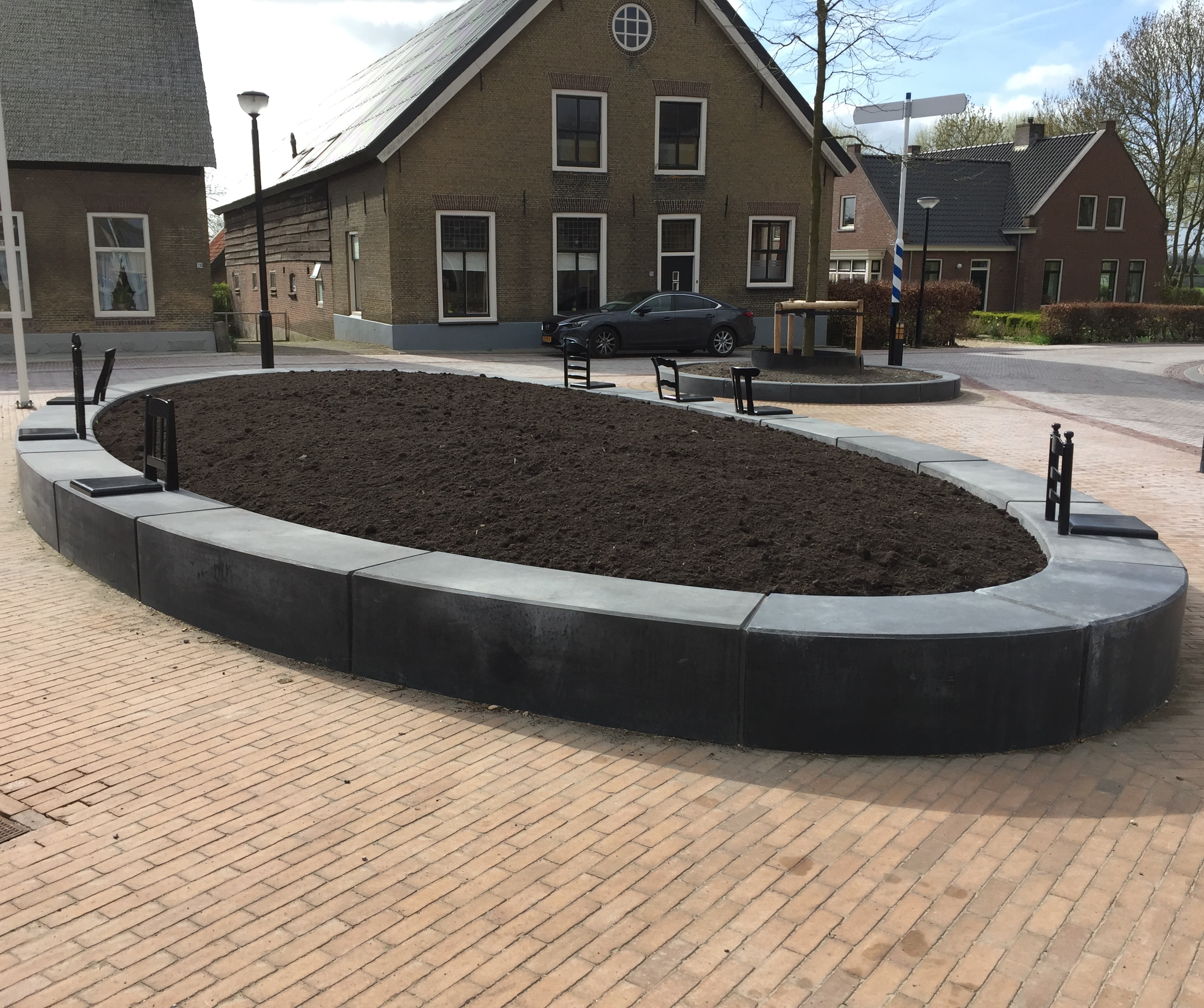 De antracietkleurige Giro Parkbanden 40x50 cm die als fundering voor de stoeltjes fungeren zijn zoals gezegd dusdanig geproduceerd dat ze een ovaal vormen. Er zijn echter ook cirkelvormige antracietkleurige Giro Parkbanden 25x50 cm geplaatst die op hun beurt weer als boomrand fungeren. Het ontwerp van de stoeltjes vindt zijn oorsprong overigens in de stoelen en leuningen van dorpsgenoten.