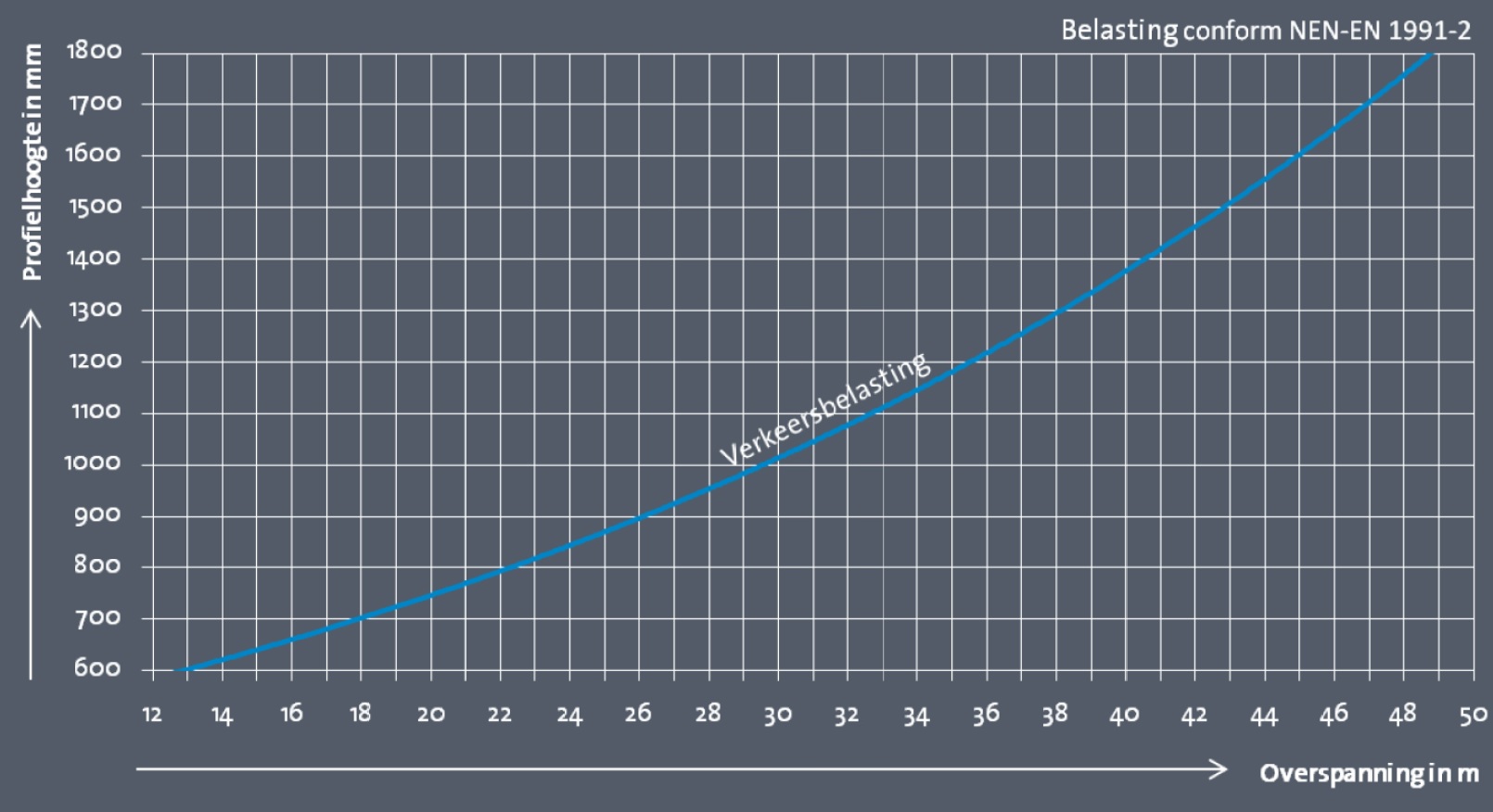 Uitgangspunten grafiek: brughoek 90å, brugbreedte 15.00 m, statisch bepaald.