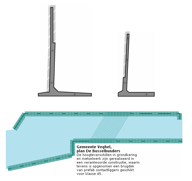 Op het gebied van keerwanden en keerwandconstructies bieden wij in principe een totaalpakket aan. Dit houdt in dat wij, behalve voor de levering, het afspannen en injecteren, kunnen zorgen voor het ontwerp, tekenwerk, de statische berekeningen en de volledige plaatsing in het werk. Bekleding met metselwerk, zonder risico op scheurvorming, is mogelijk geworden. In de elementen kunnen ankerrails worden gestort. De voegen kunnen zodanig worden uitgevoerd dat een vloeistofdichte constructie mogelijk is.